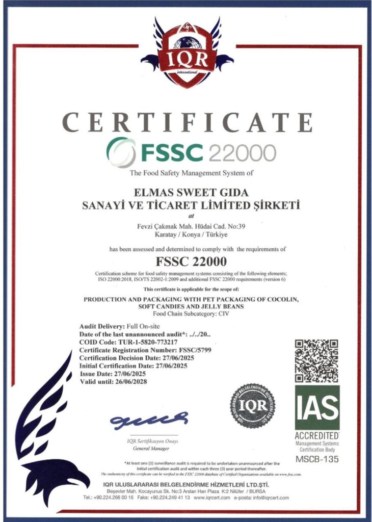 Elmas Sweet Gıda olarak, tüketicilerimize güvenilir, hijyenik ve lezzetli şekerleme ürünleri sunmak temel ilkemizdir. Tüm faaliyetlerimizde kalite ve helal gıda güvenliği yönetim sistemi standartlarına tam uyum sağlayarak; kaliteyi sadece ürünlerimizde değil, üretim sürecimizin her adımında yaşatmayı taahhüt ediyoruz.